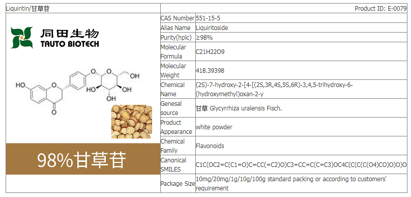 | 內容 | 上海同田 98% 高品質 甘草苷 甘草提取物 551-15-5 10mg-100kg 源頭廠家
