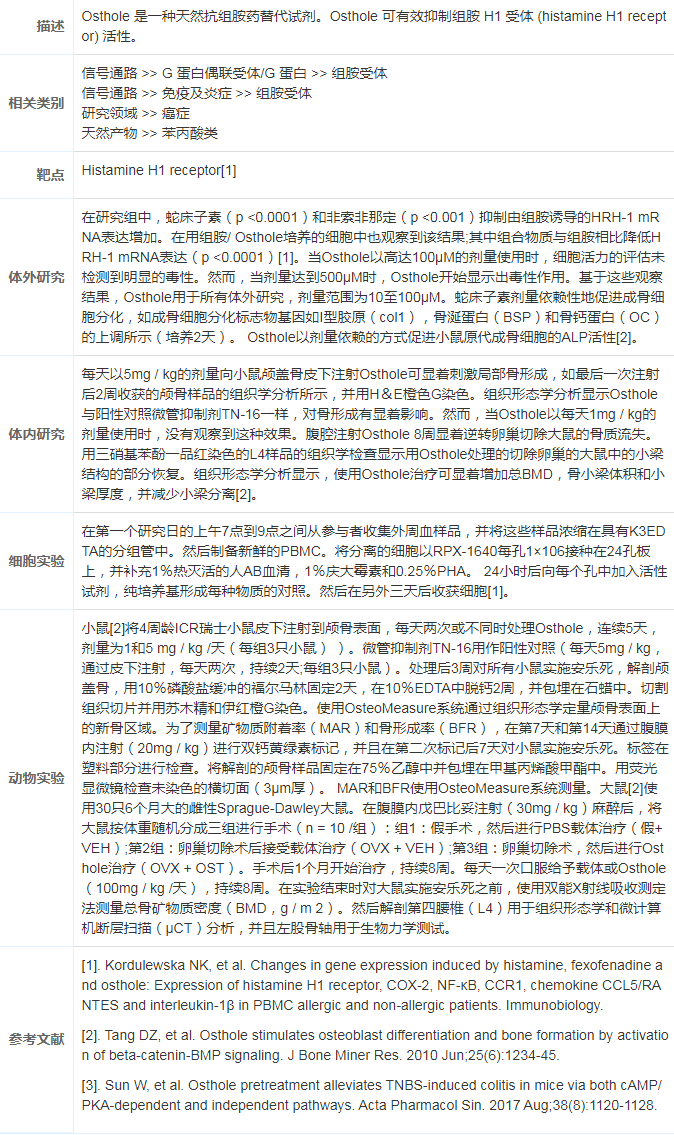 | 英文別名 | Osthole;OSTHOL;AKOS 236-34;7-Methoxy-8-(3-methyl-2-butenyl)-2H-1-benzopyran-2-one;7-METHOXY-8-(3-METHYL-BUT-2-ENYL)-CHROMEN-2-ONE;8-(3-METHYL-2-BUTENYL)HERNIARIN;Chuanxiongzine;Cnidium lactone(OSTHOLE );7-Methoxy-8-(3-methyl-2-buten-1-yl)-2H-chromen-2-one;7-Methoxy-8-(3-methylbut-2-en-1-yl)-2H-chromen-2-one;OSTHOLE(P) PrintBack;Common Cnidium Fruit Extract;Selinum oil;7-methoxy-8-(3-methyl-2-buten-1-yl)-2H-1-benzopyran-2-one;7-Methoxy-8-(3-methyl-2-butenyl)coumarin;7-methoxy-8-(3-methylbut-2-en-1-yl)-2H-1-benzopyran-2-one;7-methoxy-8-(3-methylbut-2-enyl)-2H-chromen-2-one;7-methoxy-8-(3-methylbut-2-enyl)chromen-2-one;Cnidium;Cnidium Monnieri Extract;DaMiana Extract;NSC 31868;Ost;Ostol;Ostole;7-Methoxy-8-isopentenylcoumarin;[ "" ];2H-1-Benzopyran-2-one, 7-methoxy-8-(3-methyl-2-butenyl)-;7-METHOXY-8-(3-METHYL-2-BUTENYL)-COUMARIN;Coumarin, 7-methoxy-8-(3-methyl-2-butenyl)-;XH1TI1759C;NS |